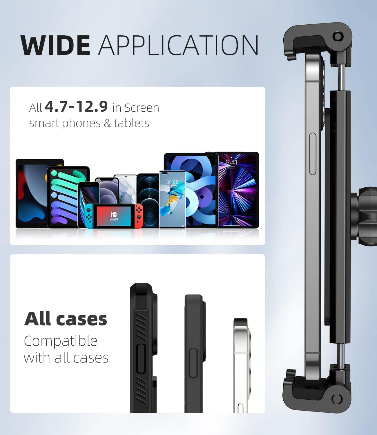 Desktop tablet stand is compatible with 4.7"-13" devices, such as iPad Pro 12.9 / 9.7, iPad 1/2 / 3/4, iPad Air 2, iPad Mini 1/2 / 3/ 4, iPhone 12 Pro Max, Surface Pro series, Samsung Galaxy Tab, Lenovo Tab, Fire HD series, and so on, no need to remove the tablet case while using.
